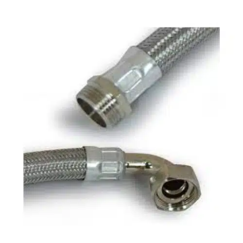 Manguera flexible modelo ARFH634-1, longitud 600 mm con codo. Conexión 1″M x 1″F. Ideal para instalaciones sanitarias y equipos de bombeo.