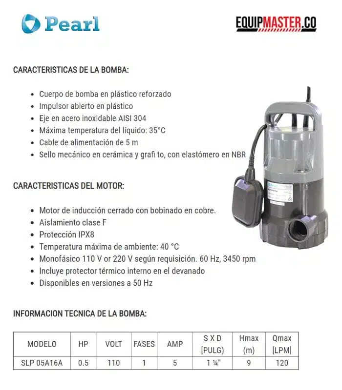 Bomba Sumergible PEARL SLP 05A16A Agua Limpia 1.1/4″ 0,5hp 110V Caudal Max: 120L/min, Altura Max: 9mts